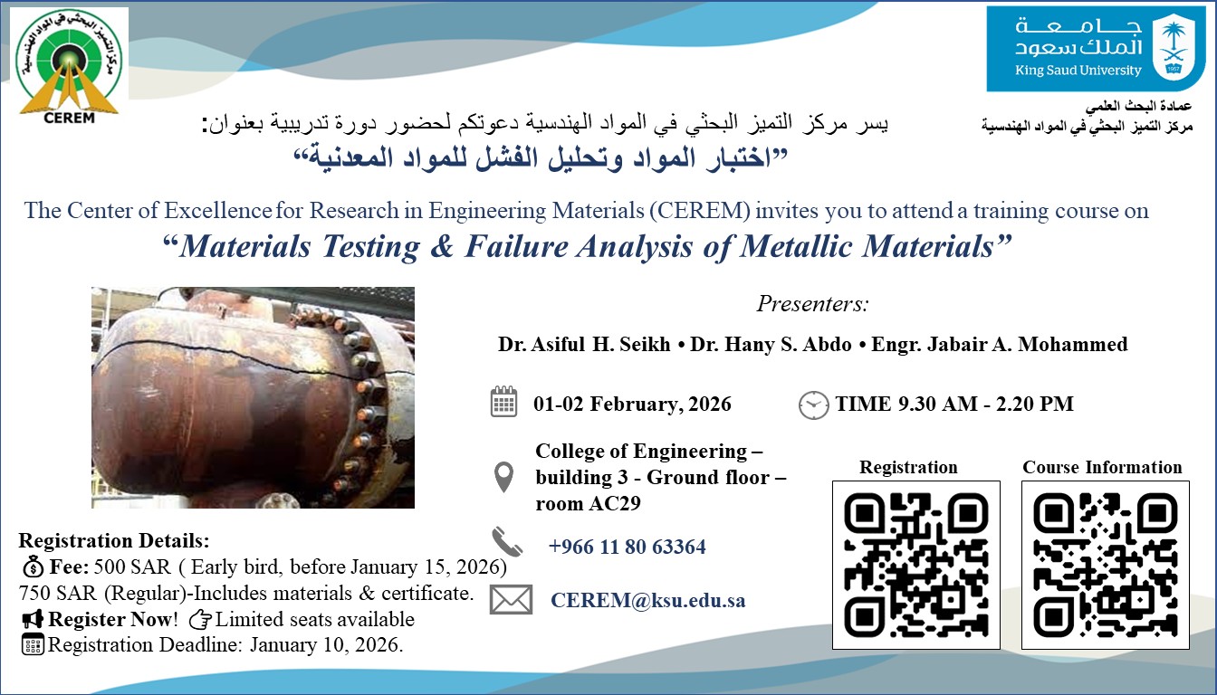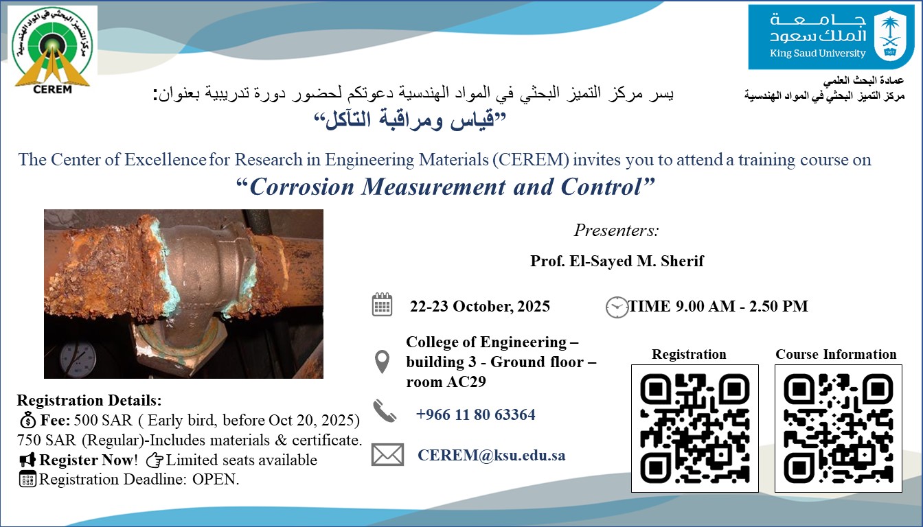 The Center of Excellence for Research in Engineering Materials (CEREM), King Saud University, successfully conducted its specialized training course titled “Corrosion Measurement and Control” on 22–23 October 2025 at the College of Engineering.