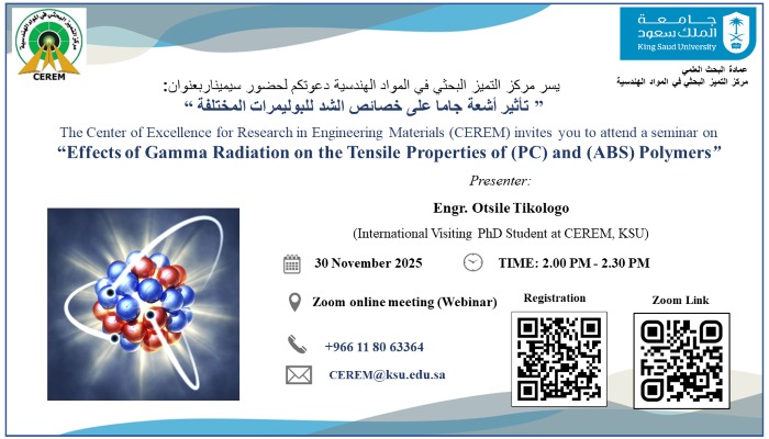 The Center of Excellence for Research in Engineering Materials (CEREM), King Saud University, will host an online seminar titled “Effects of Gamma Radiation on the Tensile Properties of (PC) and (ABS) Polymers,” presented by Engr. Engr. Otsile Tikologo, an international visiting PhD student at CEREM, KSU, will present the seminar. The seminar will talk about how gamma radiation affects the strength and stability of polycarbonate (PC) and acrylonitrile butadiene styrene (ABS) polymers, looking at changes in their ability to stretch, their structure, and how they might break. Applications such as the medical, aerospace, and nuclear sectors, which expose polymers to high-radiation environments, can benefit from the findings.
